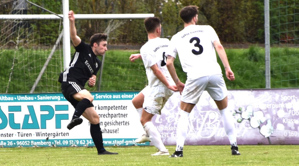 Nach der Abfuhr gegen den Spitzenreiter Tütschengereuth/Viereth wollte der FC Wacker beim Tabellenzweiten SpVgg Trunstadt zeigen, dass er auch gegen führende Mannschaften mithalten kann. Doch wie gegen den Tabellenführer ging es auch in Trunstadt los. Einen einfachen Ballverlust in der eigenen Hälfte nutzte der Trunstadter T. Düring zur frühzeitigen Führung (4. Min., 1:0). Nach diesem unnötigen Rückstand entwickelte sich ein mit viel Kampfeinsatz auf beiden Seiten sehenswertes Match, in dem Tobias Kuttler die nächste Möglichkeit für Wacker nutzen wollte (10. Min.), aber nicht durch die dichte Abwehrreihe kam. Den von Timo Renk super durch die Heimelf vorgespielte Ball, nahm Max Jerabek von der Mittellinie mit und stürmte zum Sololauf an der Abwehrreihe vorbei (11.), wurde jedoch unverständlich kurz vor dem Einschuss mit dem Abseitspfiff zurückgepfiffen. Zweikampfstark und damit immer wieder nach vorn stoßend überspielte Timo Renk des öfteren die SpVgg-Abwehr, seine Flanke von der rechten Seite (13.) lenkte Max Böhm etwas unglücklich knapp neben das Tor. Überraschend dann das trickreiche Überspielen der Wackerabwehr von Schmitt, der mit dem Zuspiel auf T. Döring den Wackerkeeper Patrick Lehner versetzen konnte und zum 2:0 (20. Min.) einschoss. Das Bamberger Team ließ aber nicht den Kopf hängen und hielt ehrgeizig dagegen und suchte den Weg nach vorn. Wieder einen gezielten Pass von Renk nahm Max Jerabek an, setzte sich spielerisch durch und erzielte den Anschlusstreffer (27. Min., 2:1).