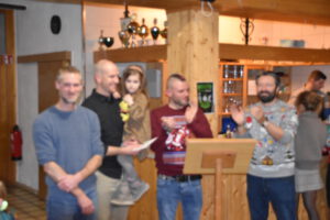 Unerwartet und unverhofft stark zu Beginn der Andrang ins Vereinsheim bis letztlich gerade noch die Plätze ausreichten. Moderator Pit Schmidt begrüßte in farblich abgestimmer Adventsfrisur die Mannschaftsspieler, die Vorstandschaft, die angejahrten Ehrenmitglieder, viele Kinder und dem Wacker wohlgesonnene Gäste. Für das vergangene Jahr bedankte er sich bei der Vorstandschaft für den überdurchschnittlichen Leistungsbeitrag für den Verein, bei den Spielern für ihren sehr guten Einsatz mit guten Platzierungen in den beiden Ligen und ihren Trainern, nach Mirco Blum dem nach Jahren wieder als verantwortlicher Trainer der Ersten sich wieder einsetzenden Jürgen Pflaum und Trainer Balu Frank Walter der Zweiten für die hervorragend aufsteigenede Tendenz seiner Schützlinge. Großer Dank auch den Spielleitern Kaufi Matthias Schlagenhaft und Patrick Philipp bei der Zweiten, der auch als Sponsor dem Wacker vorbildlich unterstützt. Der Dank galt auch dem Hauptsponsor Roland Kalb von der Brauerei Fässla, allen Helfern um den Sportbetrieb wie die Platzkassiere Winfried Spindler und Bernhard Häfner, Daniela Schramm für die Reinigung der Gaststätte und auch der Spielertrikots, den vielen Gladiatoren der köstlichen Bratwürste und Steaks aus allen Abteilungen, Christian Neamt für die perfekte und pünktliche Abstreuung des Platzes, den Jugendtrainern und Betreuern, den Vereins-Schiedsrichtern und allen Helfern, die im Ausschank, bei Veranstaltungen wie dem Johannifeuer und wie Jürgen Zolleis bei jedem anfallenden Problem bei der Heizung oder Bandenwebung zur Hilfe anwesend sind. Auch dem Pressewart Rainer Hahn galt für seine Berichte und dem FC-Wacker-Echo der Dank, der für alle auch im Namen der Vorstandschaft gegeben wurde. Lobend hervorgehoben wurde auch die AH-Abteilung, die viel für den Verein aktiv tätig ist mit Christian Kräml als Elektromeister, vor allem jetzt an der Platzanlage, dem Fliesenlegermeister Sven May für die Renovierung und Befliesung der neuen Toiletten, Erwin Trautmann und Jürgen Uibel für die Installation und Jörg Rührer für die Pflasterarbeiten am Platz. Er dankte auch der neu gegründeten Darts-Abteilung mit Roland Tornau, die den Verein aufwerten und auch das Vereinsheim zusätzlich hervorragend beleben, der er gleich in ihrer ersten Ligarunde zur Meisterschaft gratulieren durfte. Besonders gedankt und von allen ins Herz geschlossen vor allem die gute Fee der Vereinsküche und des Wirtschasftsbetriebes, Michaela Judex, die sich sprichwörtlich um unser aller Wohl kümmert und mit Hilfe ihres Noby und immer wieder Judex-Familienmitgliedern den Gaststättenbetrieb schmeißt. Allen herzlichen Dank, gewürdigt mit einer Flasche erlesenem Christ-Williams-Birne und die Bitte sich weiter für den FC Wacker einzusetzen und auch für den Kunstrasen um Spenden werbend dem Wacker die Zukunft zu sichern und den familiären Vereinszusammenhalt am Leben zu erhalten.